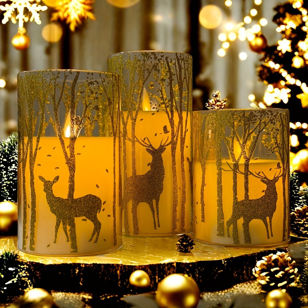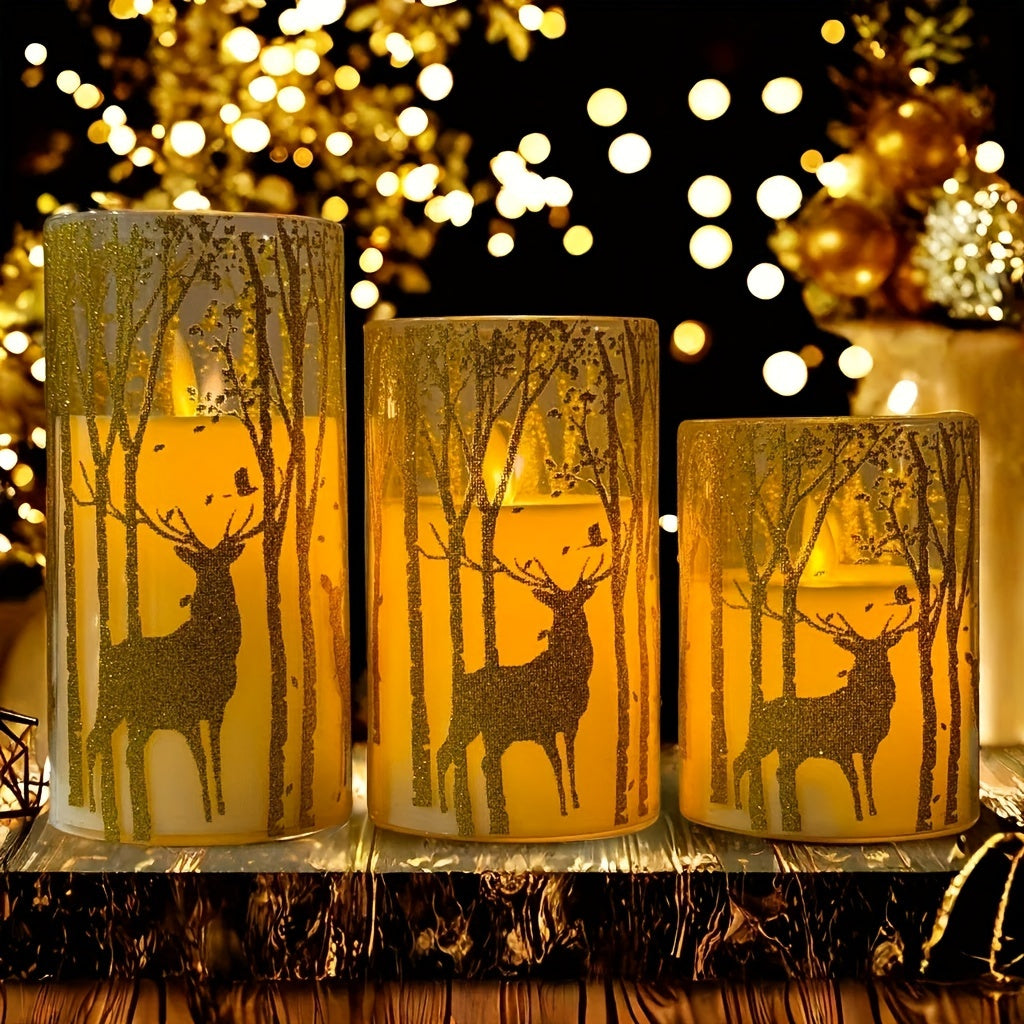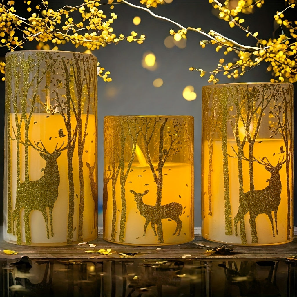 Este elegante conjunto de velas decorativas com temática de floresta e cervos é ideal para trazer um clima acolhedor e sofisticado ao seu ambiente natalino. Com detalhes em dourado e desenhos de cervos em meio a árvores, essas velas proporcionam uma iluminação suave e encantadora, perfeita para salas de estar, mesas de jantar ou ambientes festivos.