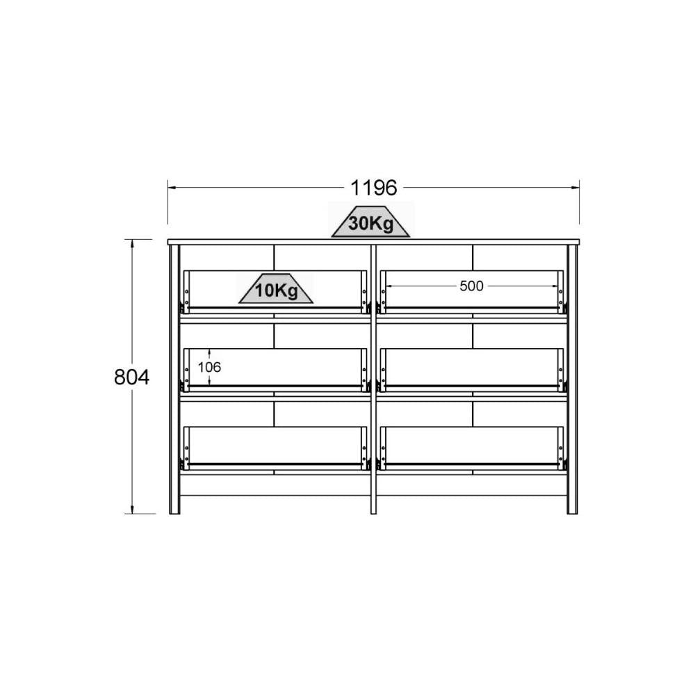 - Peso suportado: Tampo até 30 kg, gavetas até 10 kg cada
