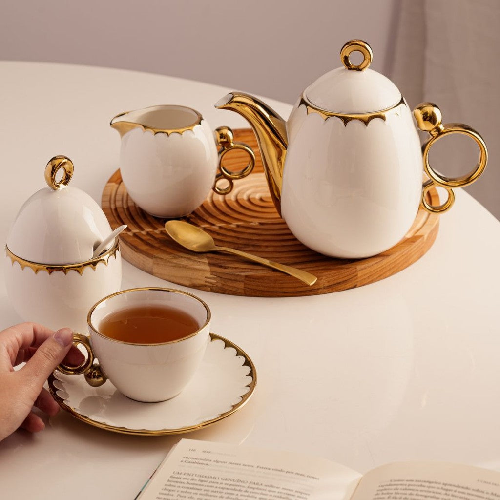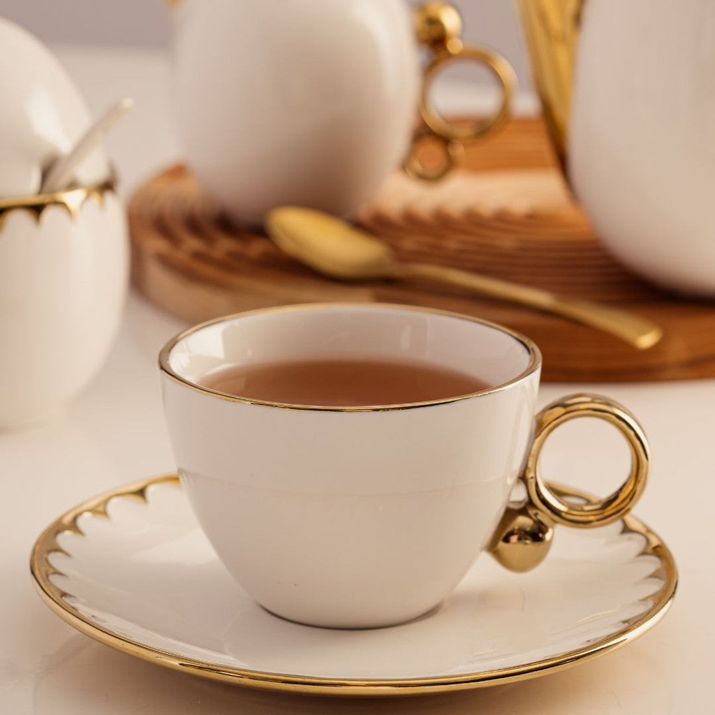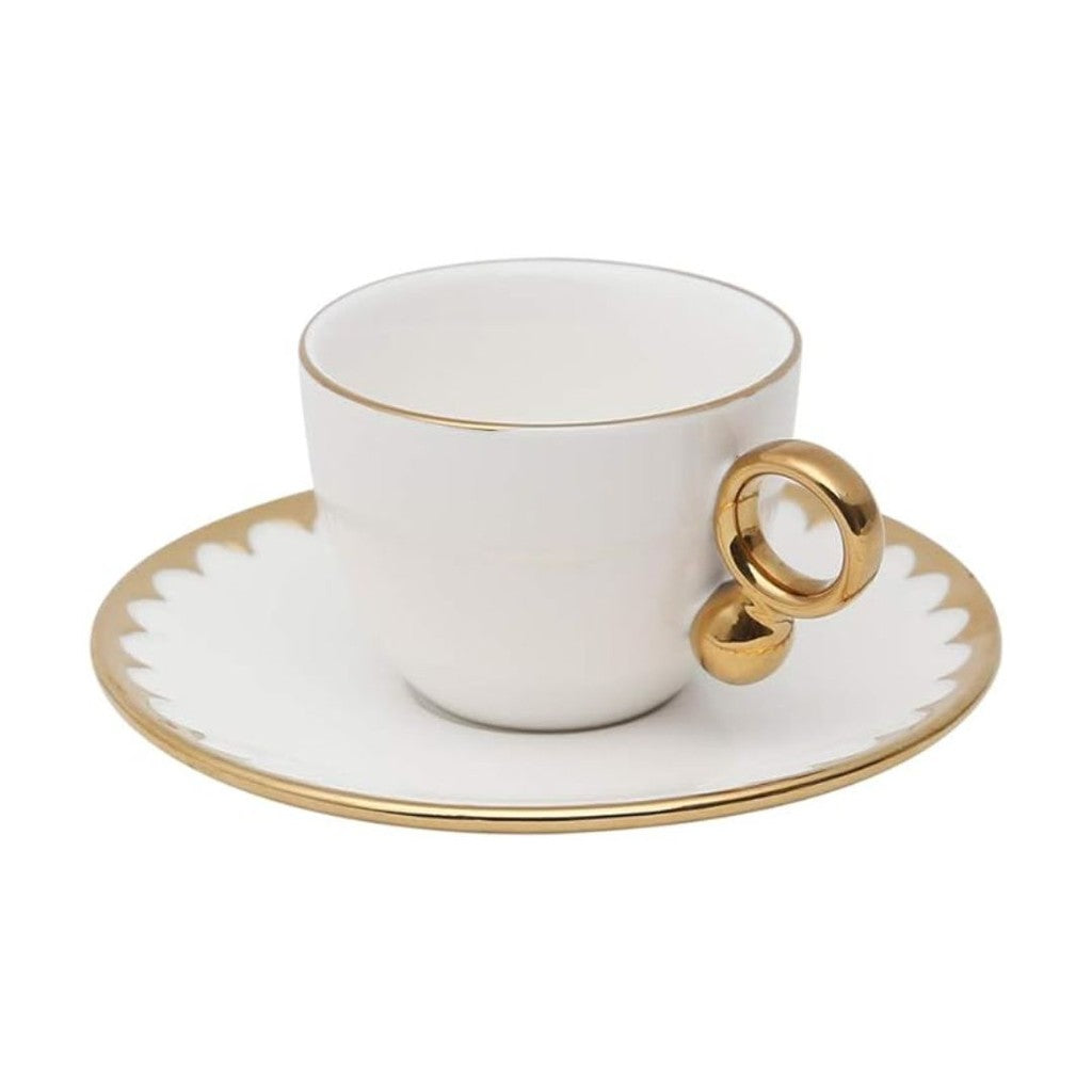 - Cada xícara de café é confeccionada em porcelana, esse jogo de xícaras e pires ainda possui um acabamento branco e dourado que confere beleza e sofisticação;