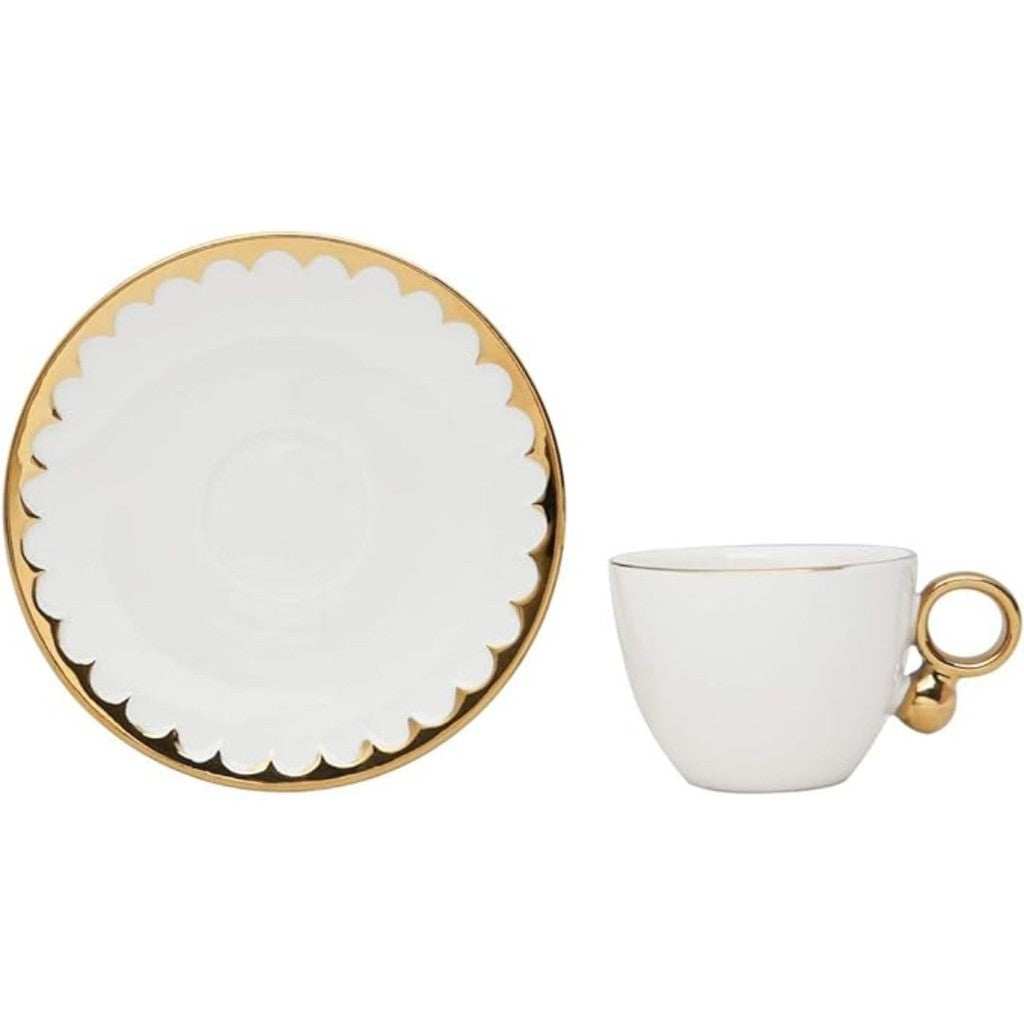 Comprimento da xícara: 9,5cmLargura da xícara: 7cmAltura da xícara: 5cmCapacidade: 90mlDiâmetro do pires: 12,8cmAltura do pires: 1,6cmMaterial: PorcelanaCor: Branco e douradoConteúdo da embalagem:06 xícaras e 06 pires