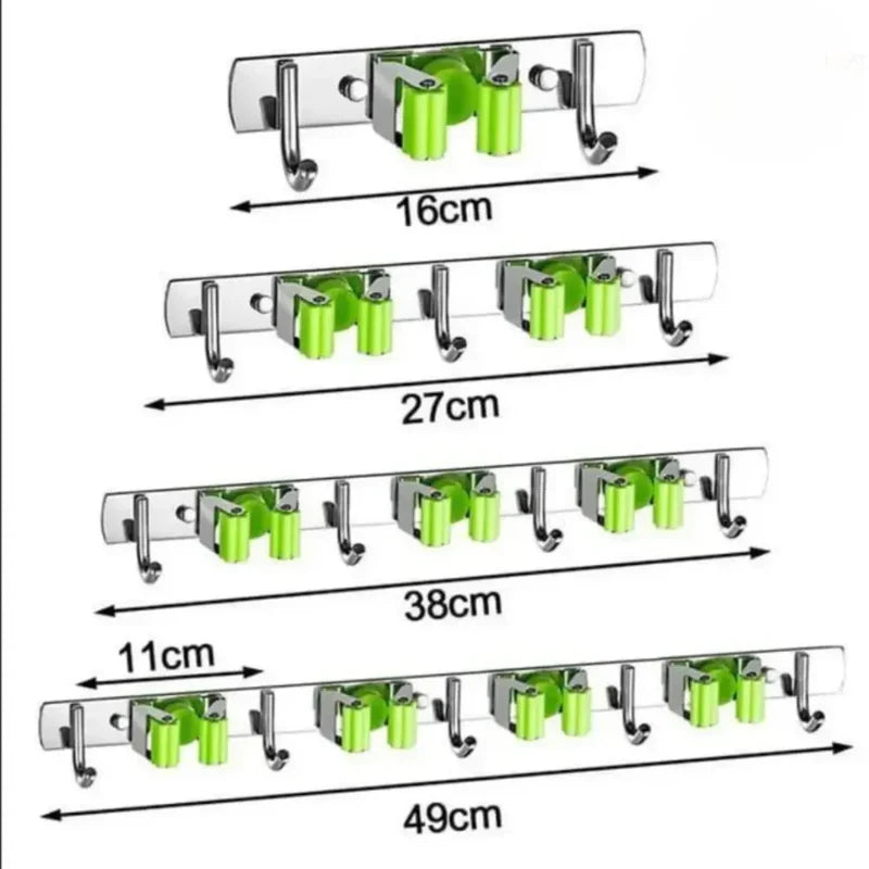 - Tipo de Suporte: Suporte de vassoura de inox com 4 fixadores de pressão e 5 ganchos