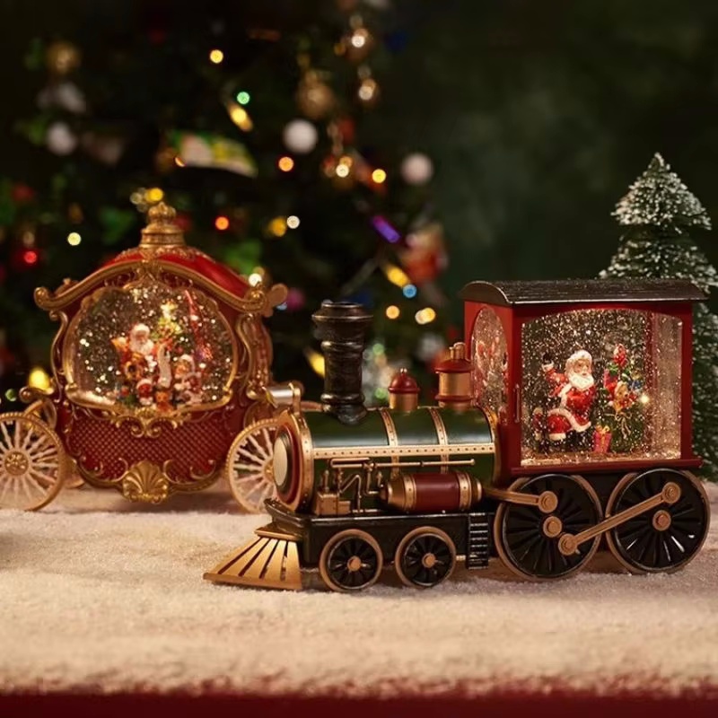 Design Retrô de Natal: Apresenta um motor vintage com Papai Noel e presentes no interior, ideal para decorar mesas, lareiras ou salas de estar.